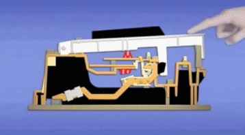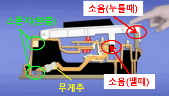 디지털 피아노 건반 소음의 원인을 알기 위해서는 먼저 건반의 내부구조(mechanism)를 이해할 필요가 있다. 건반의 구조는 건반을 뜯어보면 쉽게 알수 있으며 그림으로 보면 아래와 같다(그림 3). 플라스틱 건반에는 쇠로 된 무게추가 연결되어 있으며 건반을 누르면 무게추가 올라가고, 건반을 놓으면 무게추가 내려가면서 건반이 들려지는 구조이다. 그리고 무게추 끝 부분의 바닥과 윗면에는 스폰지가 덧대여 있어서 무게추가 부딧힐 때의 충격과 소음을 흡수한다.