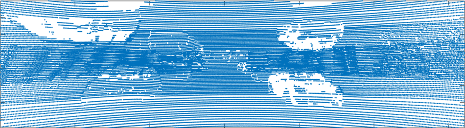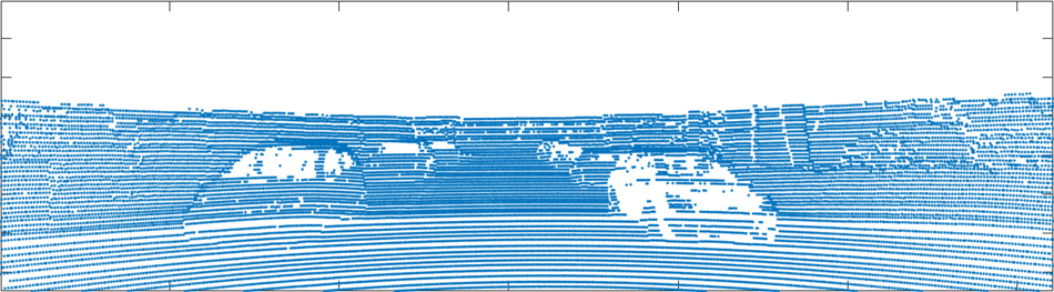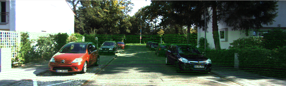 ☞ 처음에는 LiDAR - 카메라간 매핑 관계만 있으면, 이미지의 모든 픽셀에 대해 depth를 구할 수 있을 것이라 생각했다. 그러나, 그림 6에서 보는 것처럼 LiDAR 데이터는 sparse하기 때문에 LiDAR가 매핑되는 픽셀에 대해서만 depth를 구할 수 있다. 그외 픽셀에 대해서는 보간(interpolation) 등의 방법을 사용할 수 있을 것이다. 그러나, 이미지 윗부분처럼 매핑된 LiDAR 데이터가 아에 없는 영역에 대해서는 depth를 전혀 구할 수 없다.